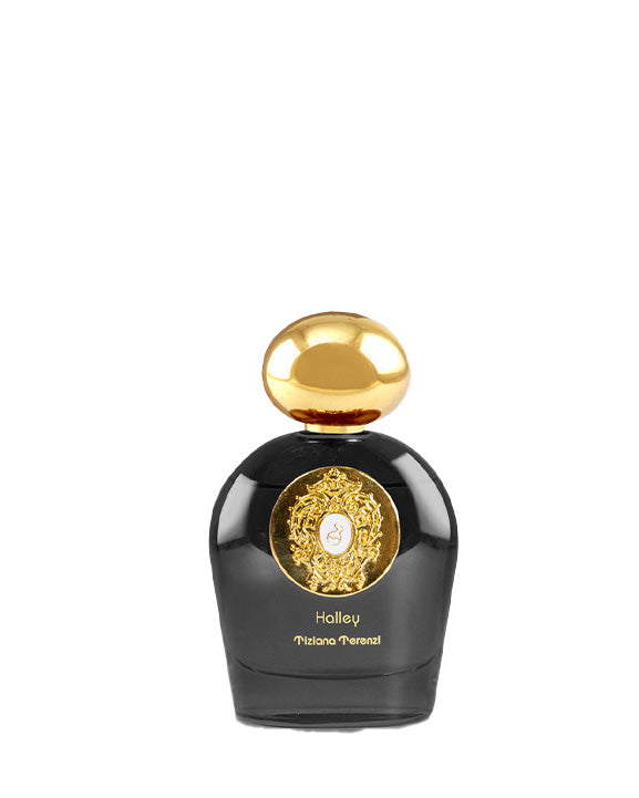The perfume opens with a magical and graceful bouquet, but with a hint of hypnotic fatalilty. Once it is smelled it is impossible not smell it again. The head reverberates with precious fruits and flowers. Among the many echoes Brazilian Passion Fruit paired with Sorrentine Lemon and Provençal Black Currant. These fruity scents are emphasized when the seductive strength of Bulgarian Rose petals comes into play. Such a rich and elegant head needs an even more intense and generous heart, in order to emphasize the multiplicity of nuances contained within. Thus, among numerous flowers we can pick out the decisive scent of Florentine Iris combined with the finesse of Tuscan Hyacinth and of precious white Mexican Tuberose. These precious flowers embrace the unripe freshness of the Petitgrain and Hawaiian hibiscus, mellowed by the softness of peach and Alpine raspberry spiced with Sri Lankan Cinnamon. Such a complex and articulated heart needs a strong base of great character to emphasize and support it. Here the regal strength of noble woods, Oudh from Laos and Cuban Cedar, are combined with the Terenzi family’s magic potion composed of Ambergris and Musk. Halley is a fragrance of irresistible and fatally seductive power, emanating a brilliant luminous trail just like the famous comet that hovers through our skies.