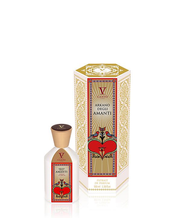 Arkano degli Amanti sits delicately on the skin, leaving behind an aura of charm and passion. It is as if each drop contains an ancient secret, a magic formula that has the power to bring hearts closer together, to make them beat in unison, in a rhythm that only love can compose. Wearing it is a ritual, a gesture of love for ourselves and those around us. It is a celebration of love in all its forms, a tribute to the invisible force that drives us to seek each other out, to recognise each other in a glance, to merge in an embrace that is eternal and at the same time ephemeral and fleeting. Arkano degli Amanti is a declaration, a silent vow that unites two souls. In it lies the very essence of love: mysterious, powerful, inexhaustible. A journey of the senses that begins with a simple gesture, but leads far away, to the place where all love finds its voice, its space, its eternal present. The fragrance reveals itself as an olfactory masterpiece, opening its sensory journey with a bright, captivating debut. Accompanying this beautiful fragrance is the enveloping flame of its candle, also inspired by the legend of the lovers. The heart and three swords painted on the vase are reminiscent of the Three of Swords card, symbolising the human heart that continues to love and fight despite wounds and adversity. The warmth and aroma released by its soft natural wax make this candle a unique masterpiece, capable of evoking memories of love, be it intense, lost or never experienced. African Rosehip emerges with a noble, wild presence, blending harmoniously with exotic Iranian Saffron and sparkling Sicilian Orange. With gentle elegance, this head allows itself to be enveloped by a sensual, deep heart where Indian Sambac Jasmine, with its profound intensity, dances with Italian Violet, evoking memories of an endless spring. The intoxicating notes of Thai Ylang Ylang blend with the succulent sweetness of Dolomite Raspberry to create an essence that pulsates with life, desire and unexplored beauty. The creation as a whole is underpinned by strong, majestic foundations, where Australian Sandalwood and Indonesian Oudh come together in a warm, enveloping embrace. With their deep and mysterious notes, Ambergris and Musk give the fragrance an unmistakable persistence, while Tuscan Oakmoss rounds off the composition by underlining its complexity and sophisticated elegance. This magical creation will take you on a journey of the senses that begins with a simple gesture, but leads far away, to the place where all love finds its voice, its space, its eternal pleasure.
