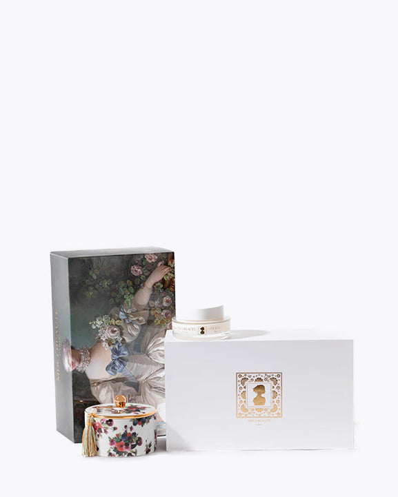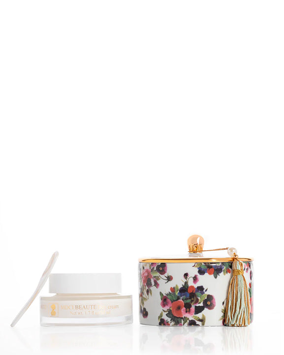 The Day Cream Box includes a 50 ml / 1.7 fl oz day cream, a limited and numbered Limoges porcelain box, and a natural mother-of-pearl spatula.